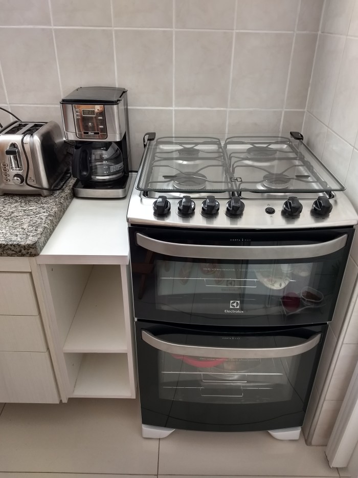 O marceneiro acabou de montar este anexo ao fogão novo, aproveitando o espaço deixado pelo antigo de seis bocas. Aparecem aí ainda a cafeteira e torradeira novas, adquiridas com os pontos de bônus do cartão de crédito.