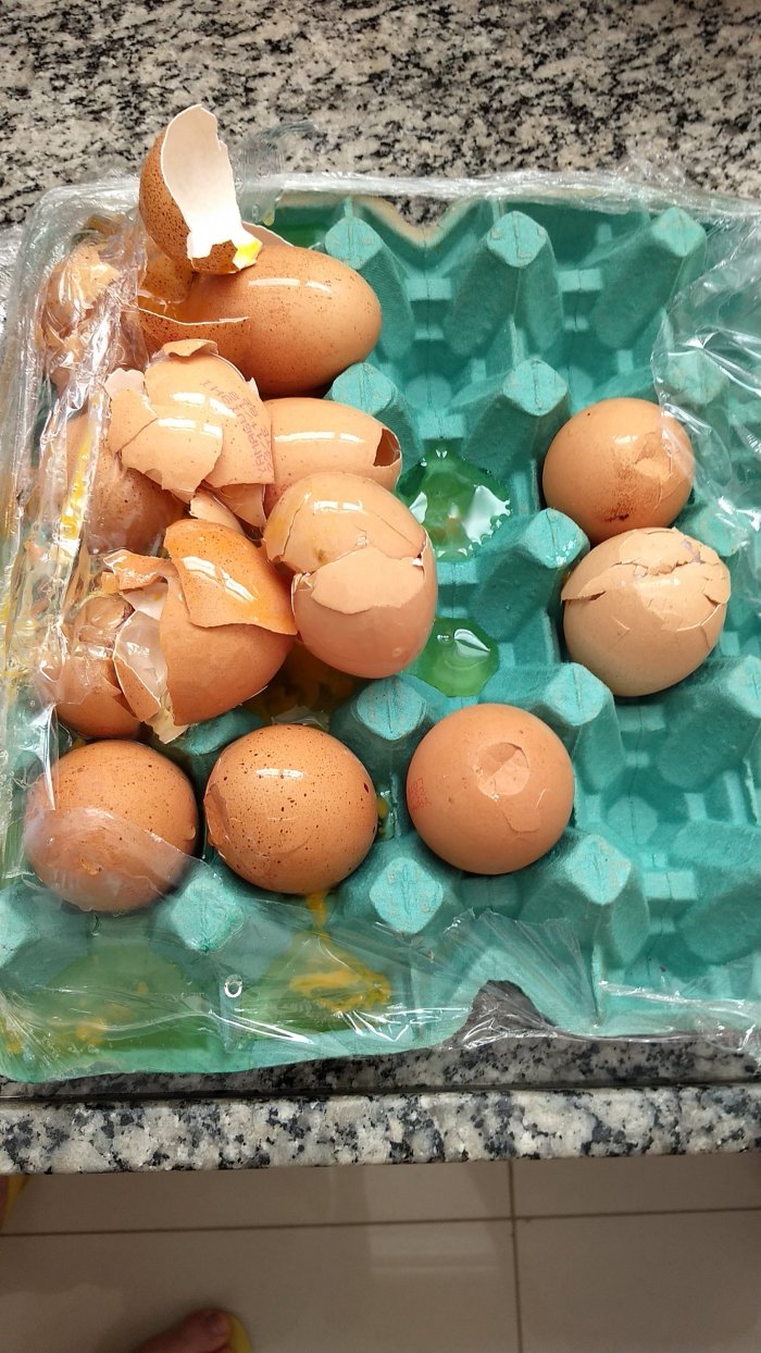 Tudo bem, mas no elevador a bandeja de ovos pendeu e não consegui evitar a queda.