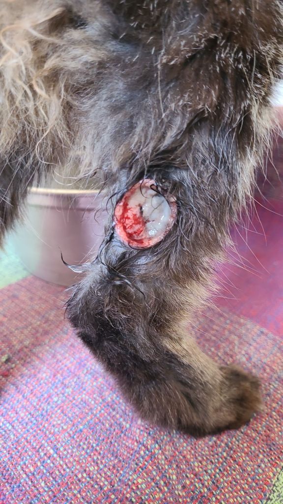 E o abcesso? Continuou crescendo até quatro dias atrás, quando observei que estava supurado porque ela estava lambendo e rompeu a pele.
