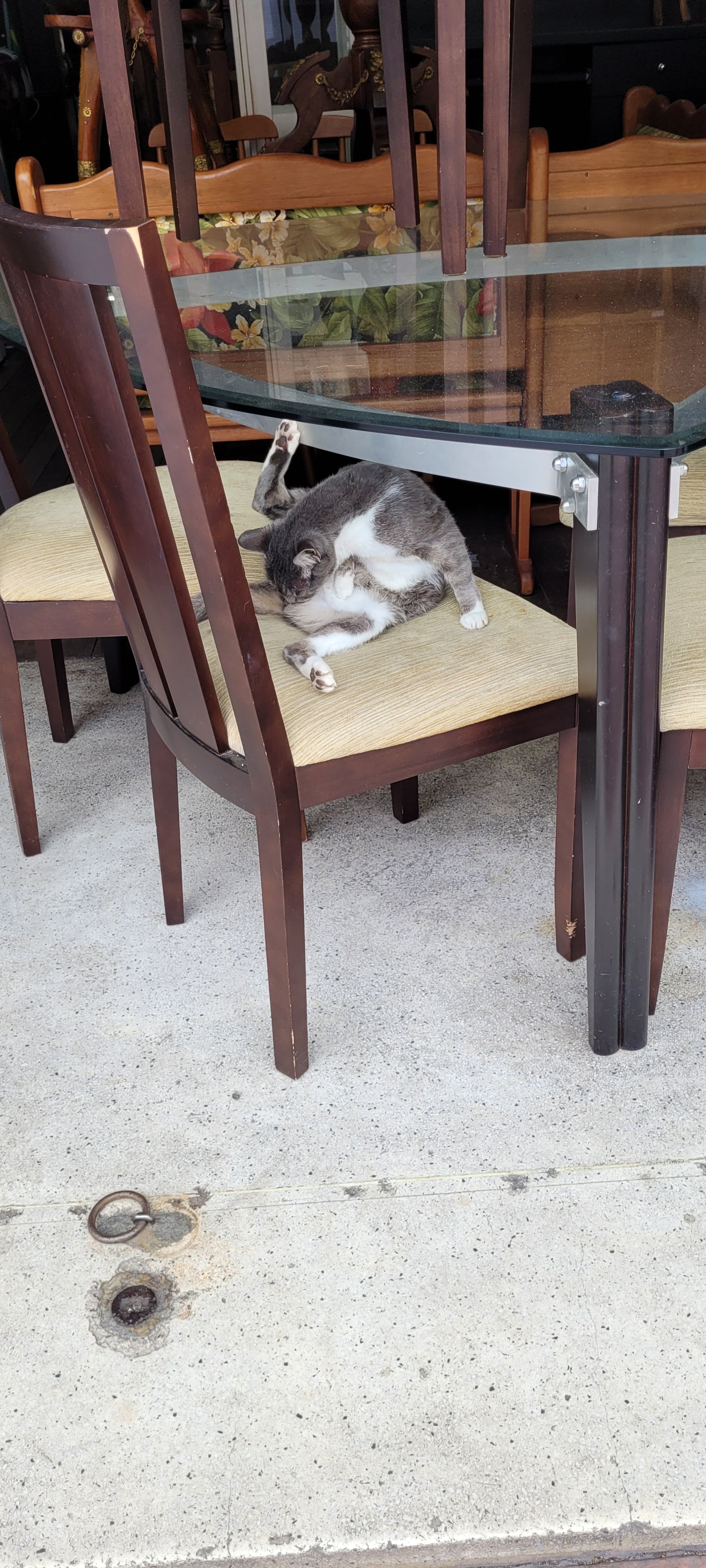 Uma parada rápida em frente duma das inúmeras lojas de móveis usados para fotografar a gatinha na cadeira.